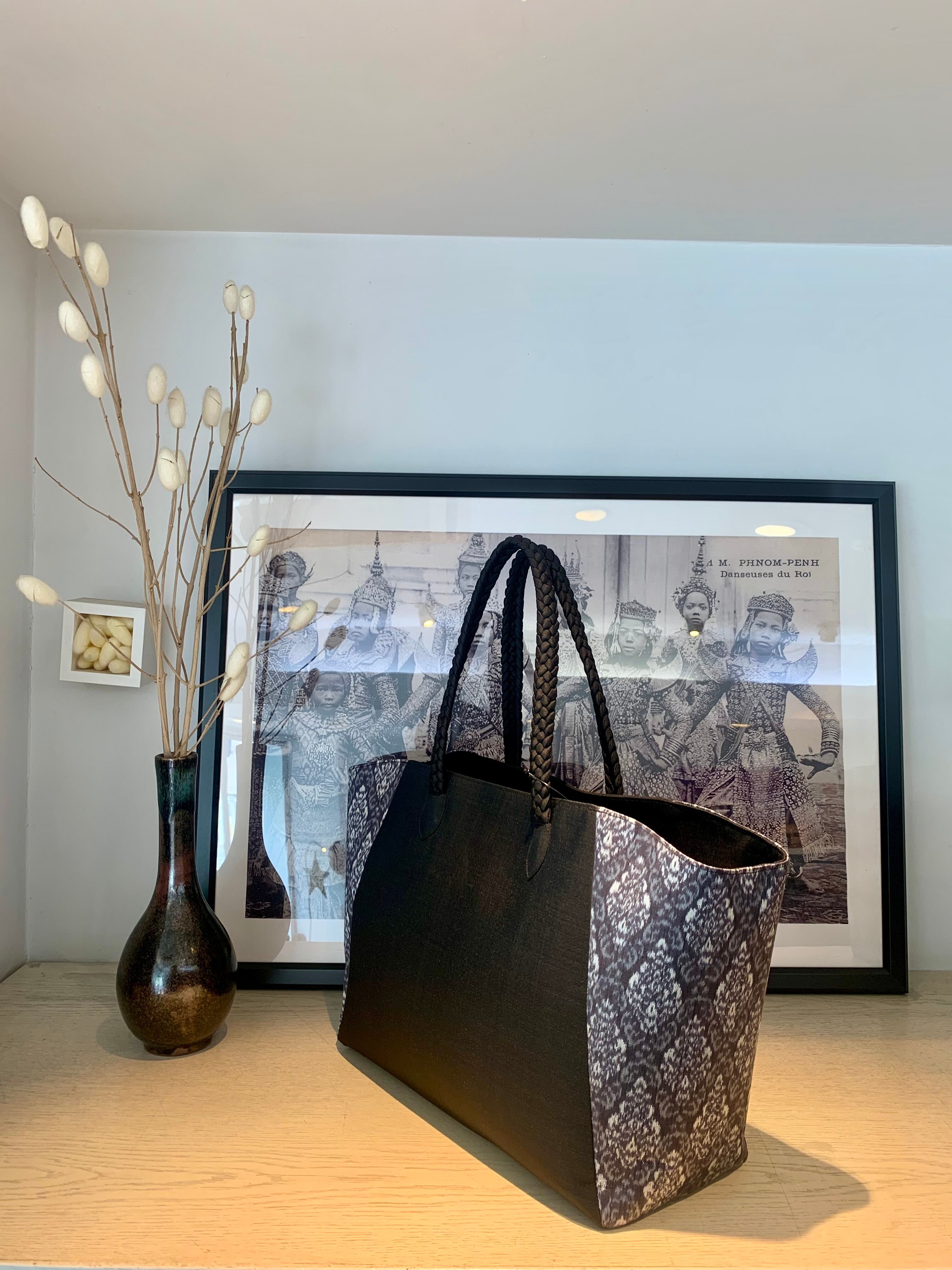 カンボジア産の上質なシルクを使用した絣バッグ。