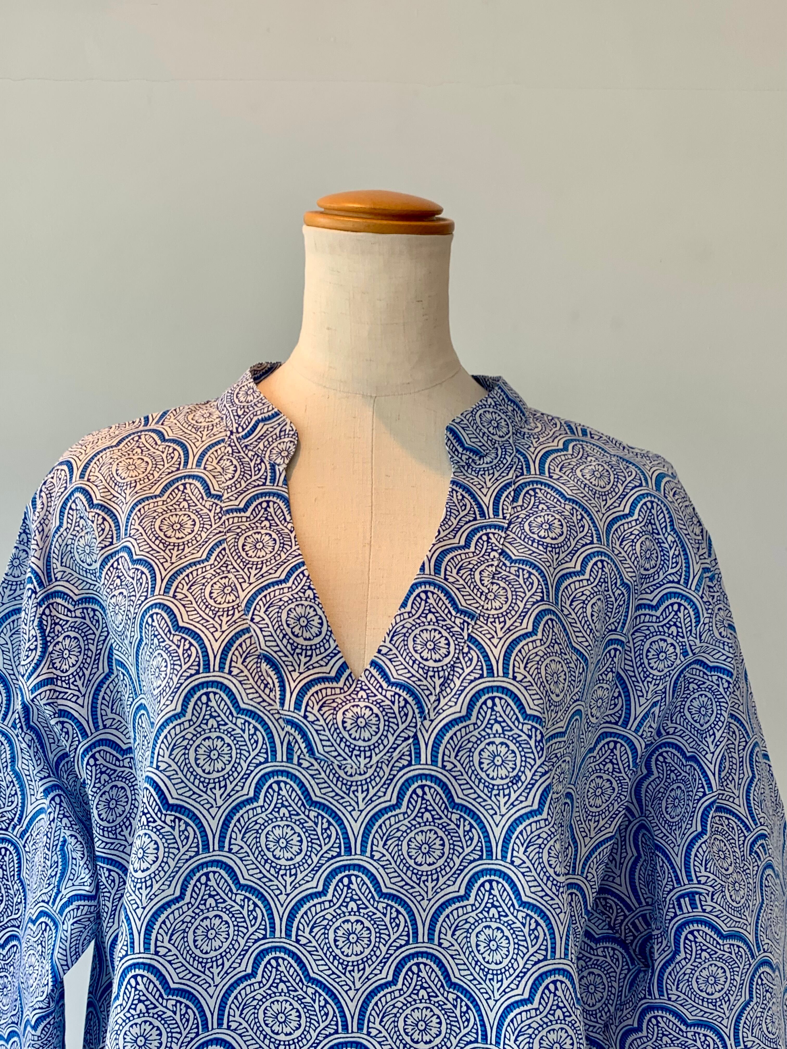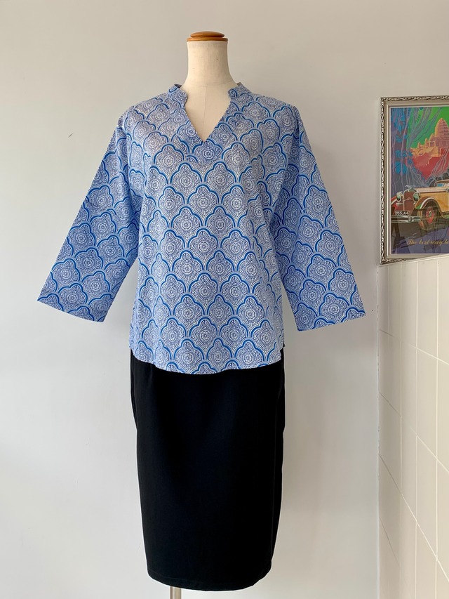 ブラウス 涼しい ブルー インド綿 高級綿ブロックプリント 春夏ファッション